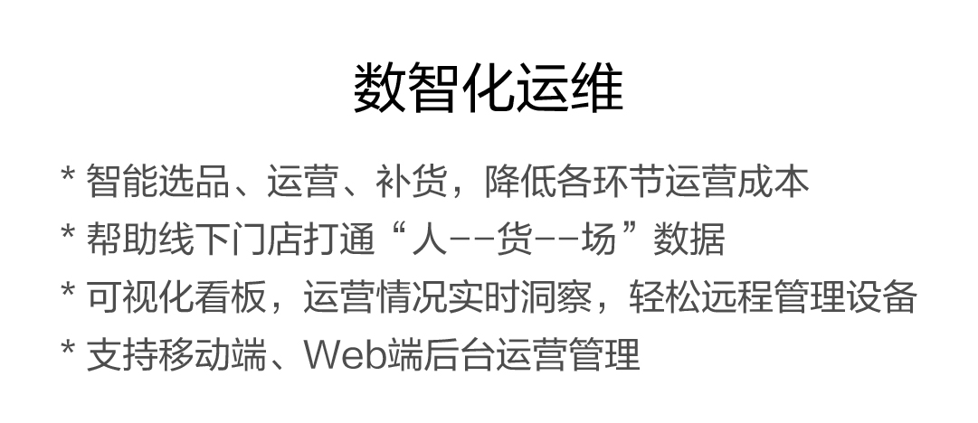 * 智能选品、运营、补货,降低各环节运营成本 * 帮助线下门店打通“人--货--场”数据 * 可视化看板,运营情况实时洞察,轻松远程管理设备 * 支持移动端、Web端后台运营管理